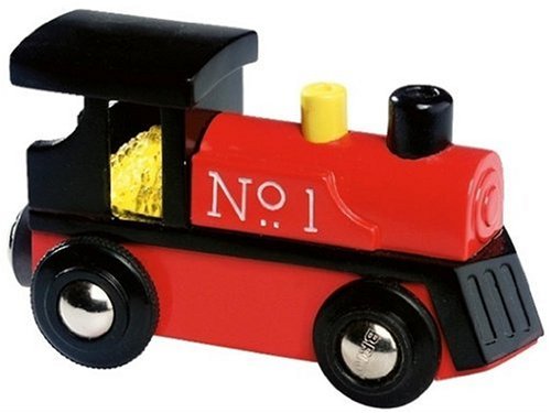 All aboard for BRIO fun. This classic wooden train comes with battery-powered engine sounds, a glowing boiler and a chimney that "toot-toots." The faster your child moves the engine, the faster the engine sounds. Light and sound effects are powered by 3 "1.5V" button-cell batteries (included). Engine measures 3.5 inches long.